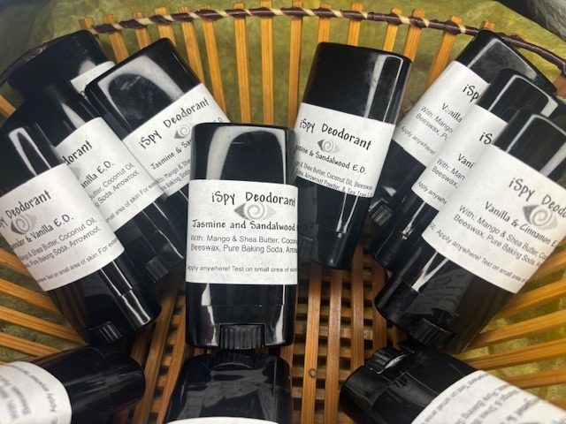 Mango & Shea Butter, Coconut Oil, Beeswax, Baking Soda, Arrowroot, & Essential Oils.